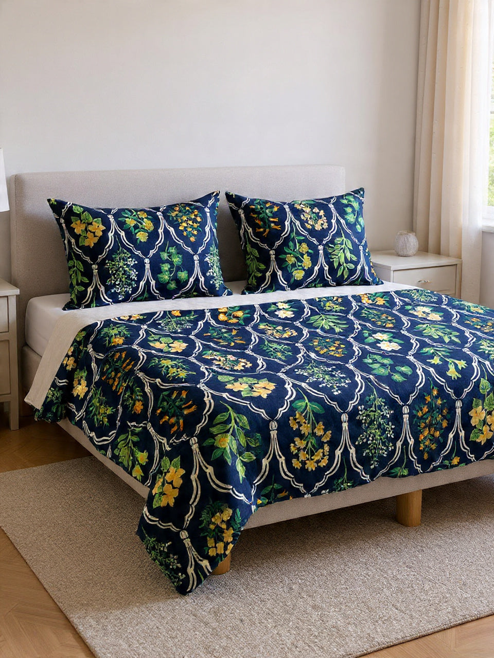 Royal Blue Bedsheet with Red & Pink Floral Design – Soft Cotton Double Bed Sheet